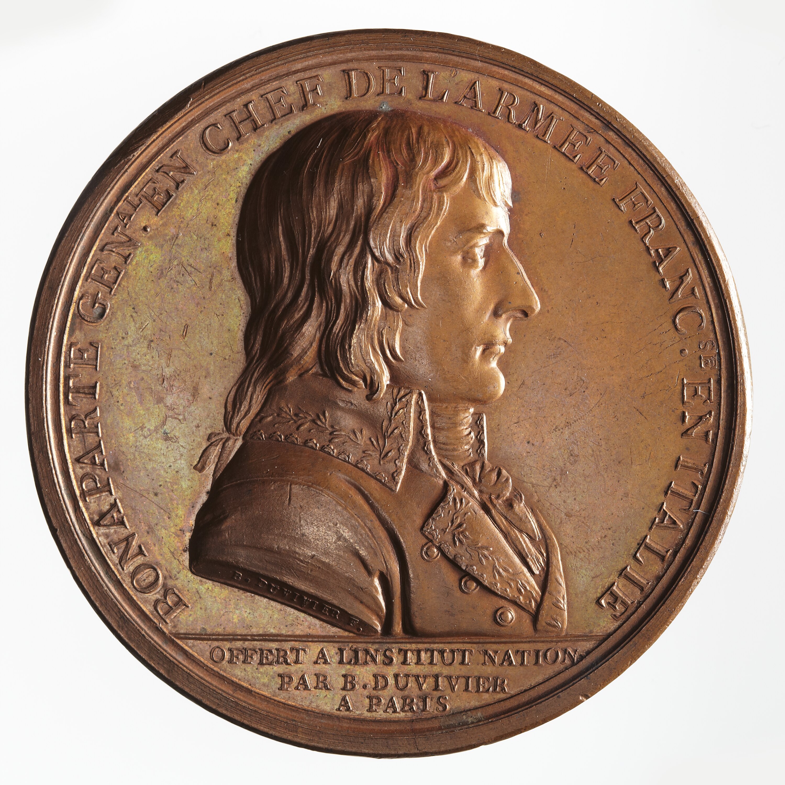 Draped bust of Napoleon facing right; around above, BONAPARTE GENAL. EN CHEF DE L'ARMEE FRANCSE. EN:ITALIE (translation: Bonaparte, General in Chief of the French Army in Italy); in exergue in three lines: OFFERT A L'INSTITUT NATION. / PAR B. DUVIVIER / A PARIS (translation: Presented to the National Institution by B. Duvivier, Paris); on bust truncation, B. DUVIVIER F. (the second 'V' double entered)