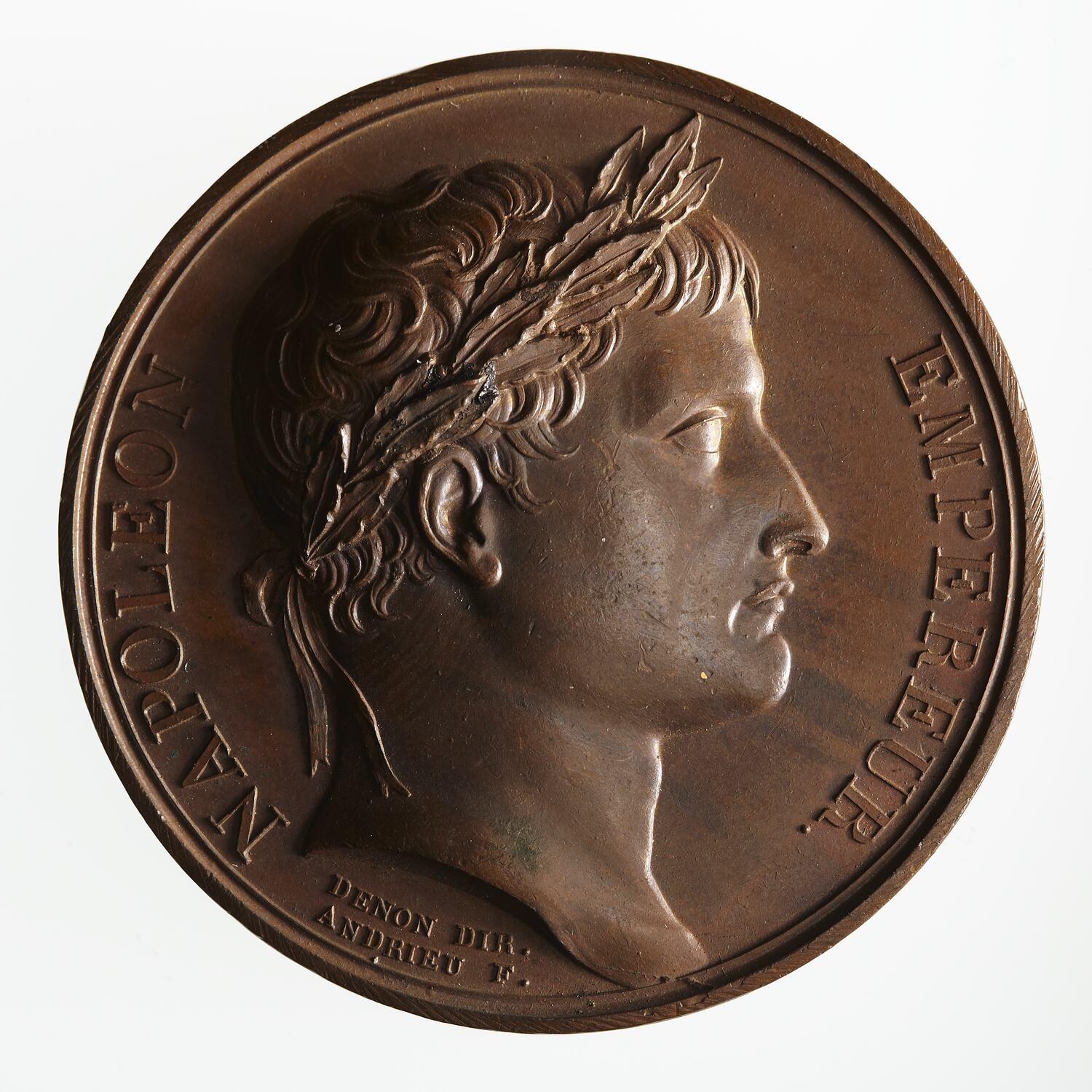 Laureate head of Napoleon facing right, around, NAPOLEON EMPEREUR; below head in small lettering, DENON DIR. ANDRIEU F.