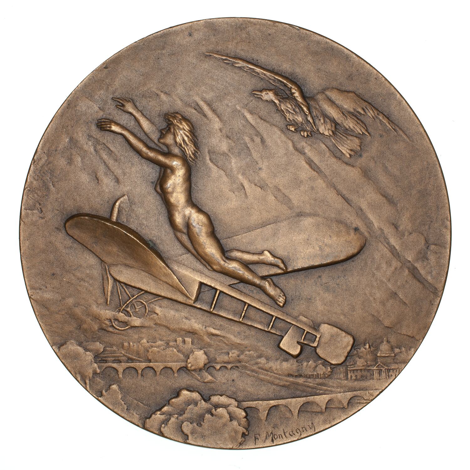 Round bronze medal commemorating aviation, by Françoise Montagny, Paris Mint, France, 1920s.