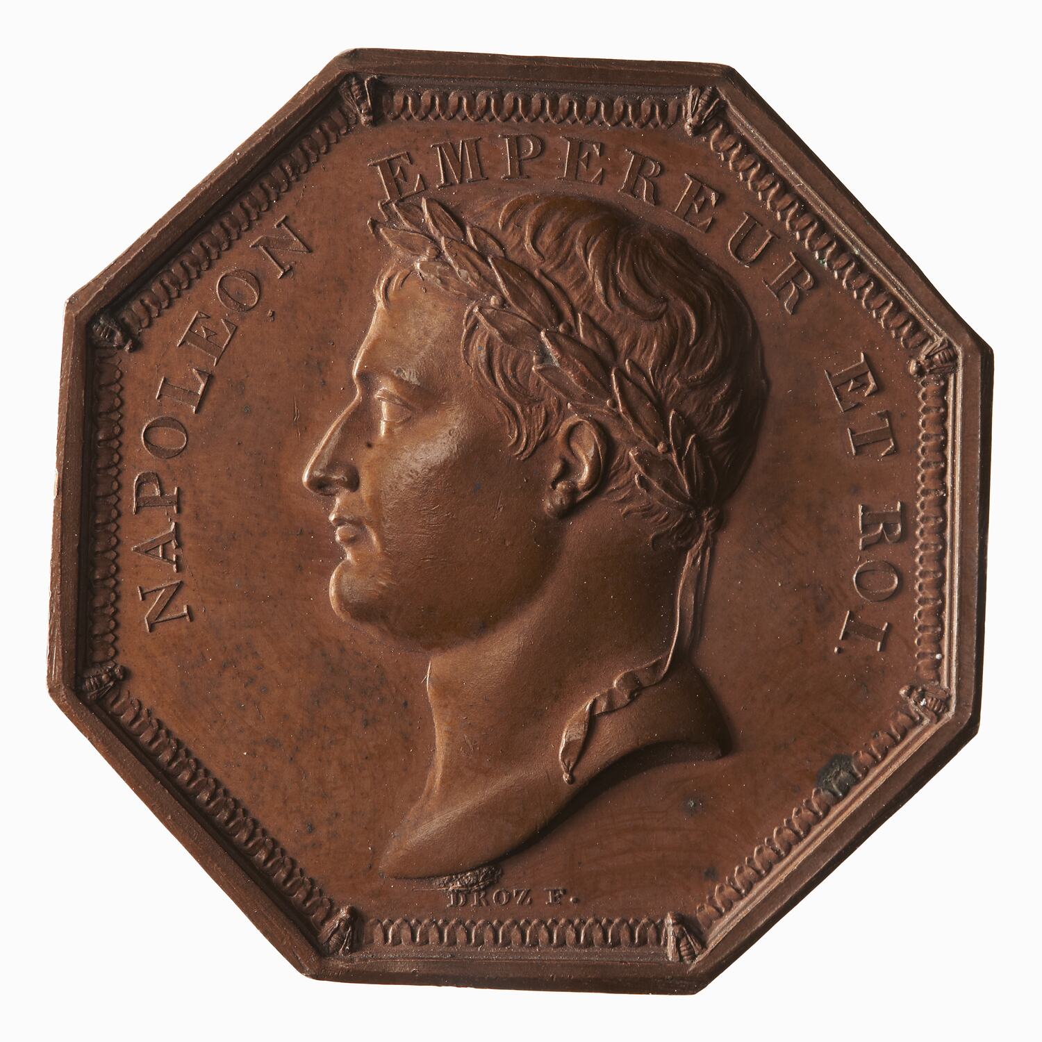 Laureate head of Napoleon facing left; around, NAPOLEON EMPEREUR ET ROI; below, DROZ F.
