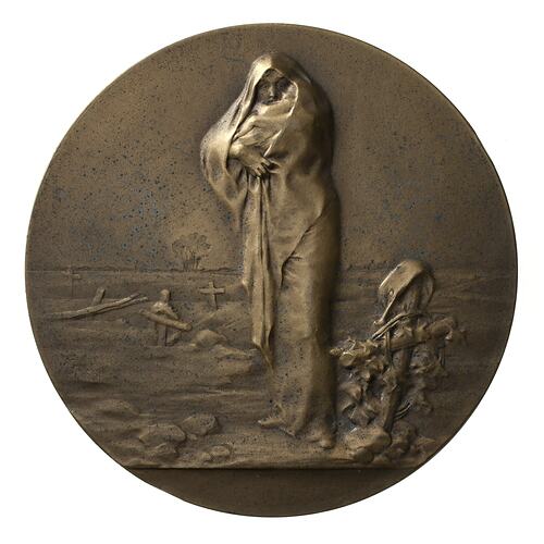 Grief-stricken female figure cradling a baby. Her draped figure stands beside a grave marked by a crudely made wooden cross with a hanging wreath and French soldier's cap. Similar crosses mark several other graveyards in the barren landscape.