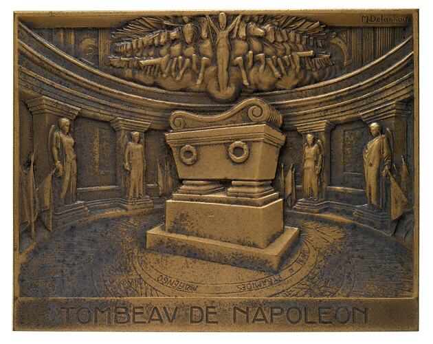 Rectangular bronze plaquette. The obverse depicts the tomb of Napoleon I, within a circular space under the dome of Les Invalides in Paris. In the centre, the sarcophagus rests on a plinth, on a circle which is inscribed with the names of Napoleon's military victories. Around the wall are columns, each with a sculpture of Victory. Above the tomb is a cloud bearing cavalry charging into battle, with a leader standing with arms reaching upwards in the centre. Inscription below and artist's signature upper right. The reverse is blank.