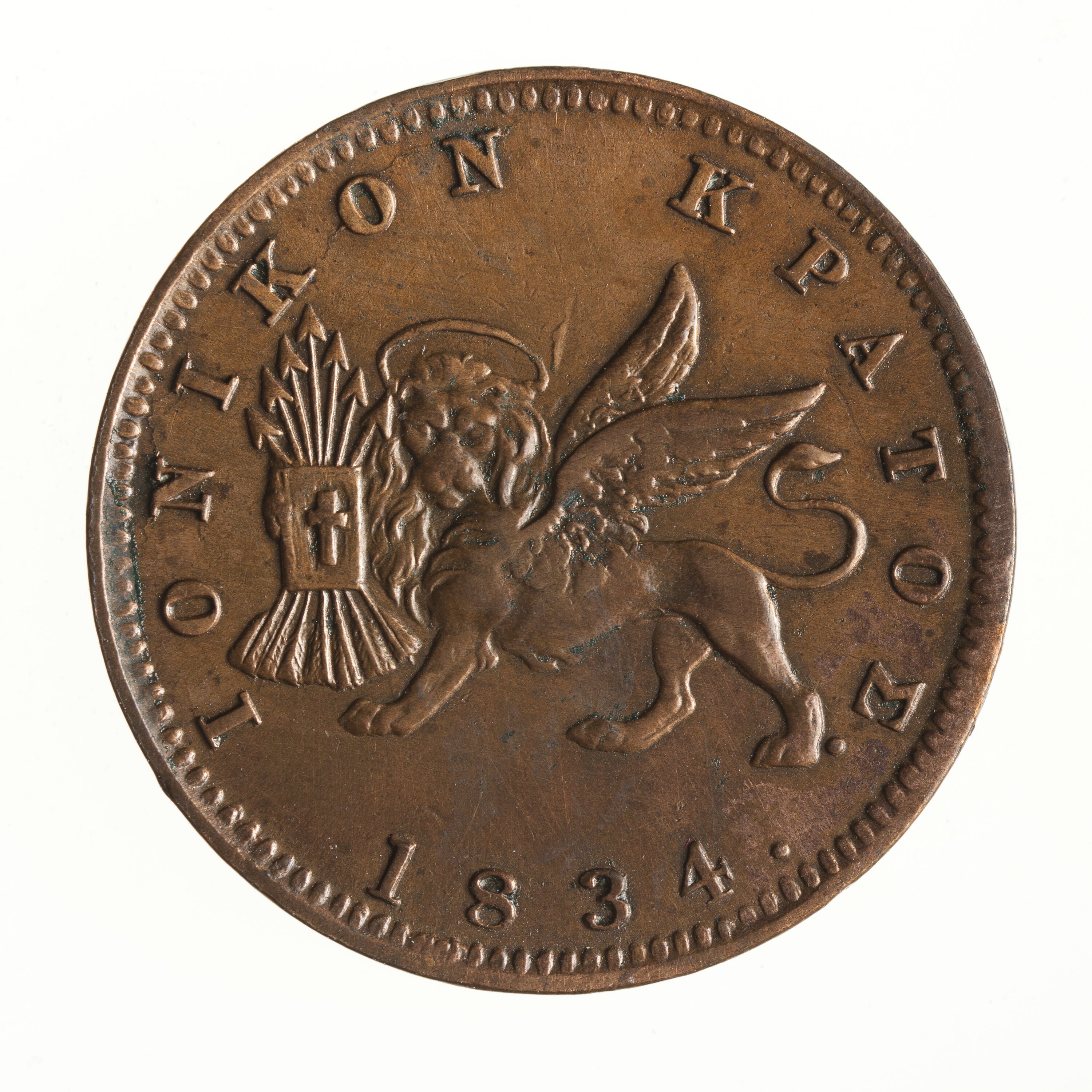 Winged lion of St. Mark facing to left holding Bible and seven arrows; below, 1834.; around above in Greek, IONIKON KPATOS
