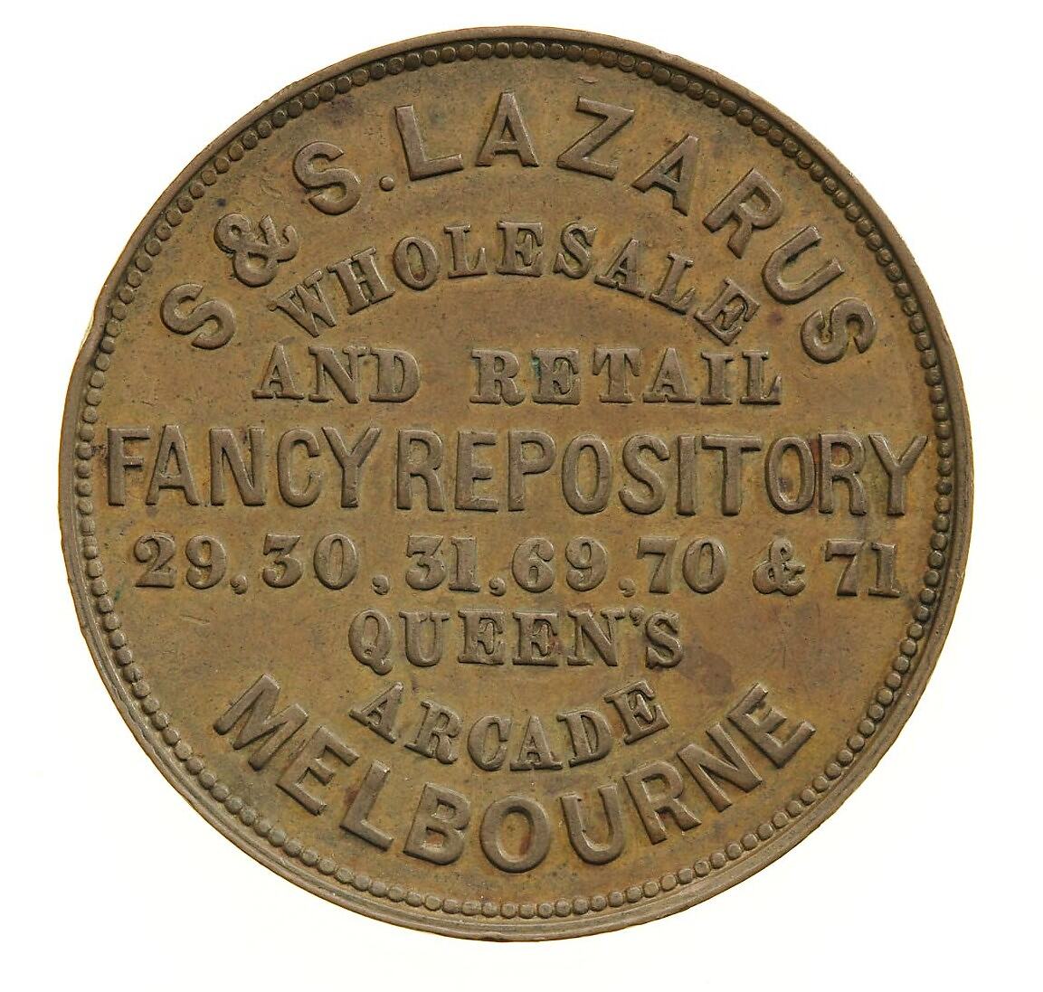 A round copper token (34 mm diameter) giving the name address and business of the issuer: S & S. Lazarus, 29, 30, 31, 69, 70, 71 Queen's Arcade Melbourne, wholesale and retail fancy repository, importers of Birmingham and Sheffield ware, stationary etc. The token has no pictorial element.