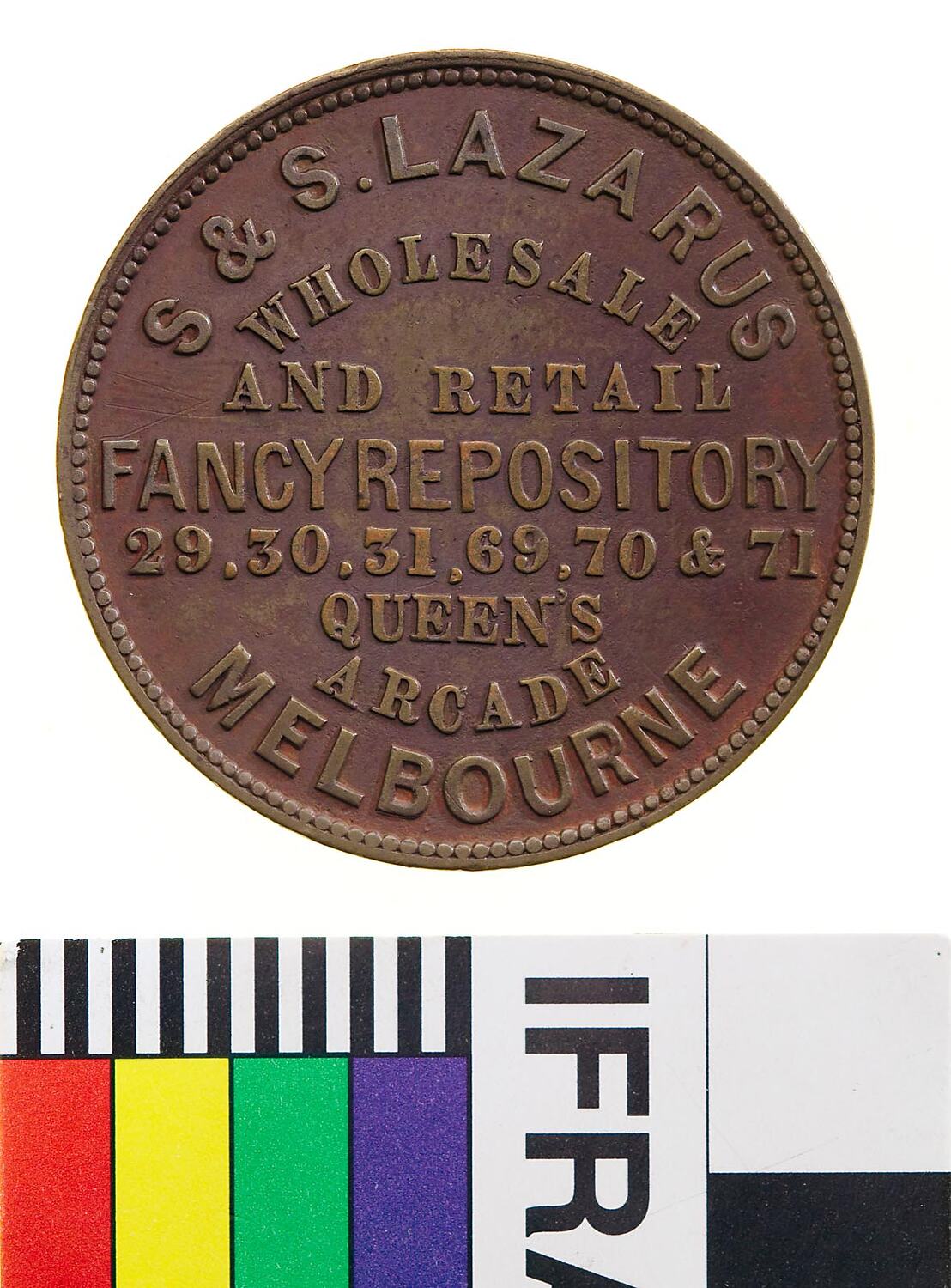 Obverse: S & S. LAZARUS WHOLESALE AND RETAIL FANCY REPOSITORY 29, 30, 31, 69, 70 & 71 QUEEN'S ARCADE MELBOURNE Reverse: IMPORTERS OF BIRMINGHAM AND SHEFFIELD WARE STATIONARY &c..