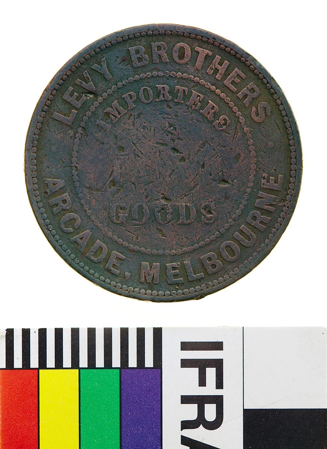Copper One Penny Token, minted by W.J. Taylor, London. Issued by Levy Bros & Co, Fancy Goods Importers, Melbourne, 1855. In 1852 the Levy brothers, Goodman, Nathaniel and Lewis, established a fancy goods warehouse and importing business in Lonsdale Street, Melbourne. Another brother, Alfred, was a travelling sales representative. They moved to Queen's Arcade in 1853. In 1858 the business moved to Bourke Street, then later to the corner of Flinders Lane and Elizabeth Street, and later to Little Collins Street. In 1890 the business returned to Lonsdale Street. Nathaniel and Lewis retired in 1867, and Goodman took a partner, Walter Josephs. Alfred was murdered on the road from Beechworth to Melbourne, and Goodman moved to England to manage the London end of the business. In 1896 Horace, son of Goodman, was admitted as a partner. When Walter Josephs died in 1907 the business was converted to a Limited Proprietary company. In 1912 the business was still running in Lonsdale Street, with a bulk store in Franklin Street. An advertisement from the time described them as Merchants, Wholesale Distributors and Importers, and stated that they also had operations in London, Hamburg and New York.