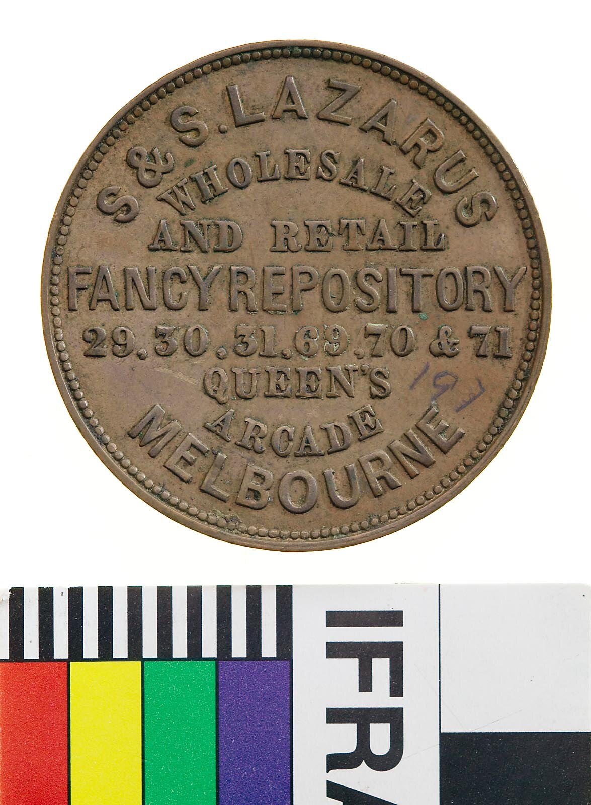 A round copper token (34 mm diameter) giving the name address and business of the issuer: S & S. Lazarus, 29, 30, 31, 69, 70, 71 Queen's Arcade Melbourne, wholesale and retail fancy repository, importers of Birmingham and Sheffield ware, stationary etc. The token has no pictorial element. This token has 197 pencilled in field on obverse