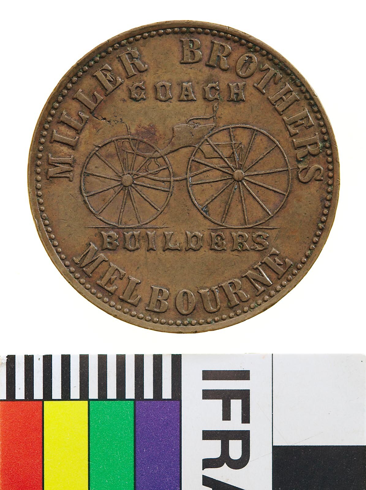 Obverse: MILLER BROTHERS MELBOURNE COACH BUILDERS Reverse: VICTORIA 1862 IN VINO VERITAS T. STOKES MAKER MEL.