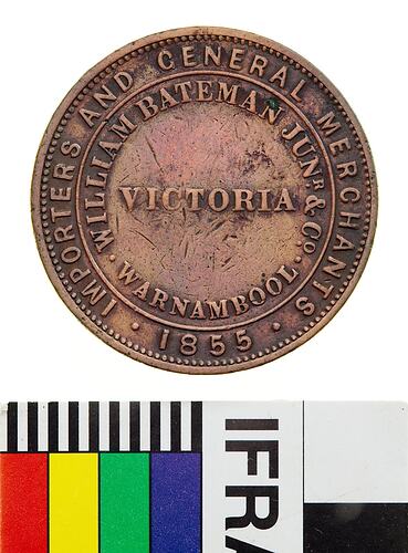 Obverse: WILLIAM BATEMAN JUNR. & CO. WARNAMBOOL VICTORIA IMPORTERS AND GENERAL MERCHANTS 1855 Reverse: AUSTRALIA
