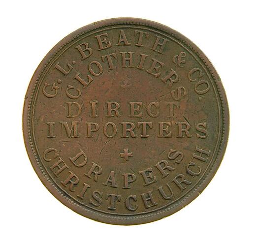 A round copper token (31 mm diameter). The piece features the name, address and business of the issuer: G.L Beath & Co., Argile House, Cashel Street, Christchurch, importers, clothiers and drapers. The reverse features a coat of arms with lion supporters.