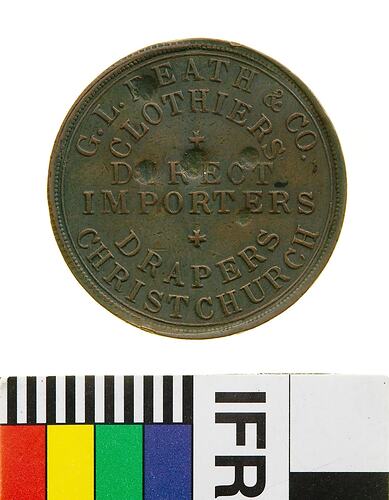 A round copper token (31 mm diameter). The piece features the name, address and business of the issuer: G.L Beath & Co., Argile House, Cashel Street, Christchurch, importers, clothiers and drapers. The reverse features a coat of arms with lion supporters. This token has some heavy circular knocks to the obverse.