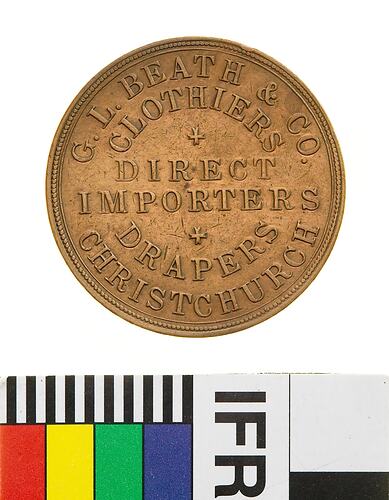 A round copper token (31 mm diameter). The piece features the name, address and business of the issuer: G.L Beath & Co., Argile House, Cashel Street, Christchurch, importers, clothiers and drapers. The reverse features a coat of arms with lion supporters.