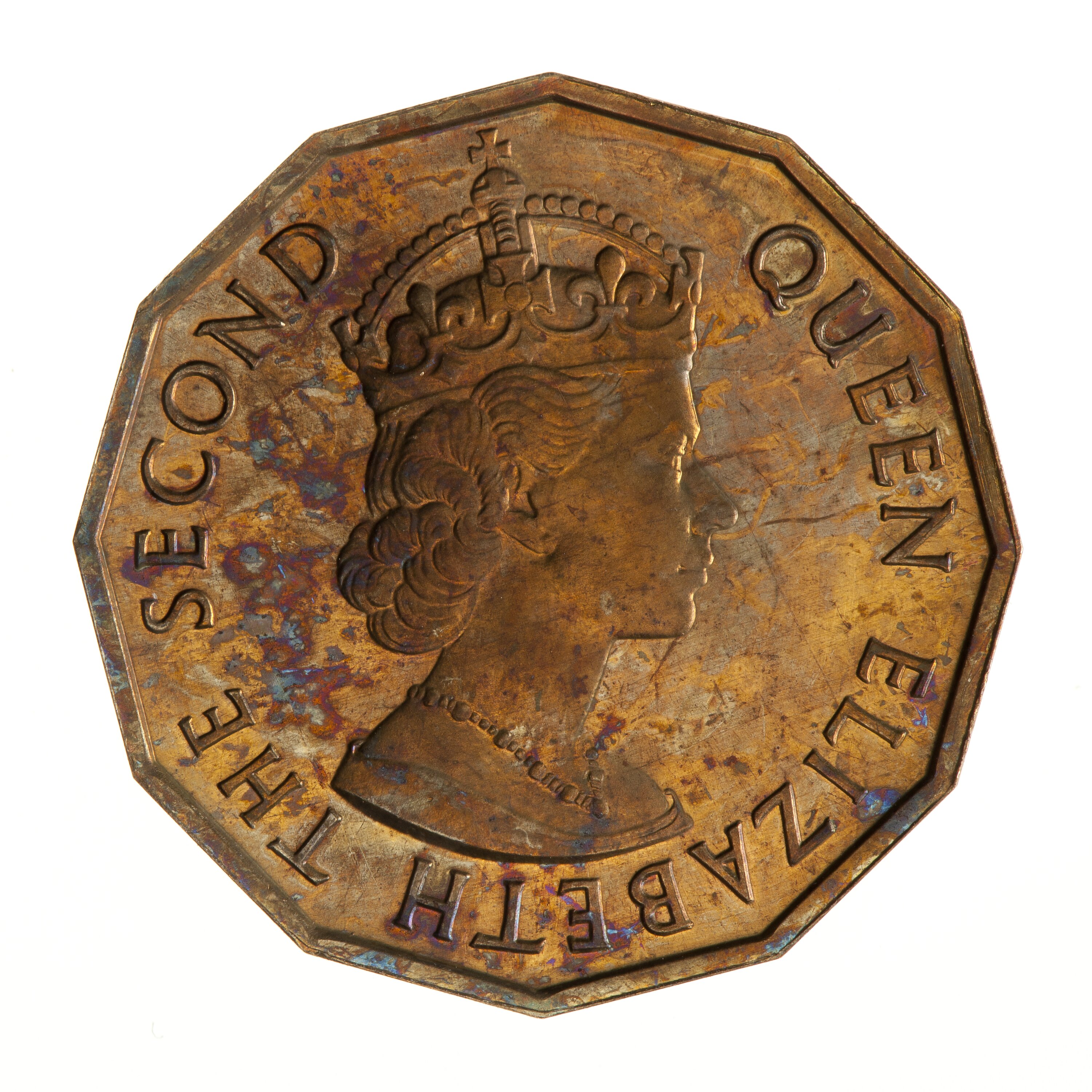Crowned bust of the queen facing right; around, QUEEN ELIZABETH THE SECOND; artist's initials, CT, incuse on bust truncation