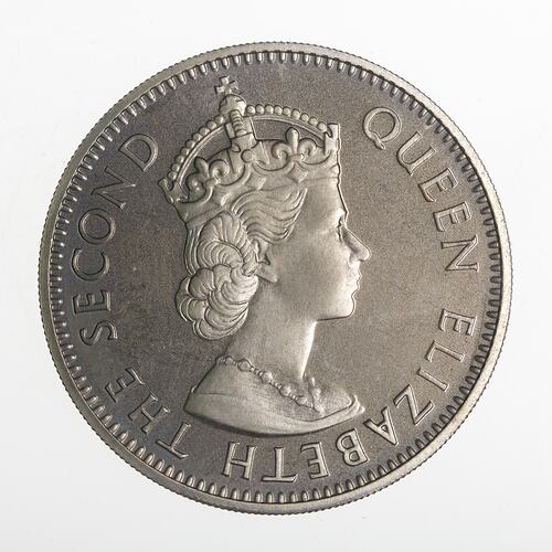 Crowned bust of the queen facing right; around, QUEEN ELIZABETH THE SECOND; artist's initials, CT, incuse on bust truncation