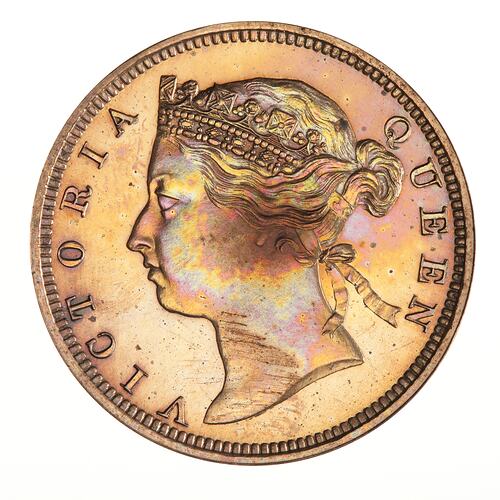 This proof example of the 2 cents was acquired by Dr. Howat at the closure of the Sydney Mint in 1926. It had formed part of the Mint's exhibit at the 1879-80 Sydney International Exhibition being provided to the Mint by the Royal Mint, London for that purpose.