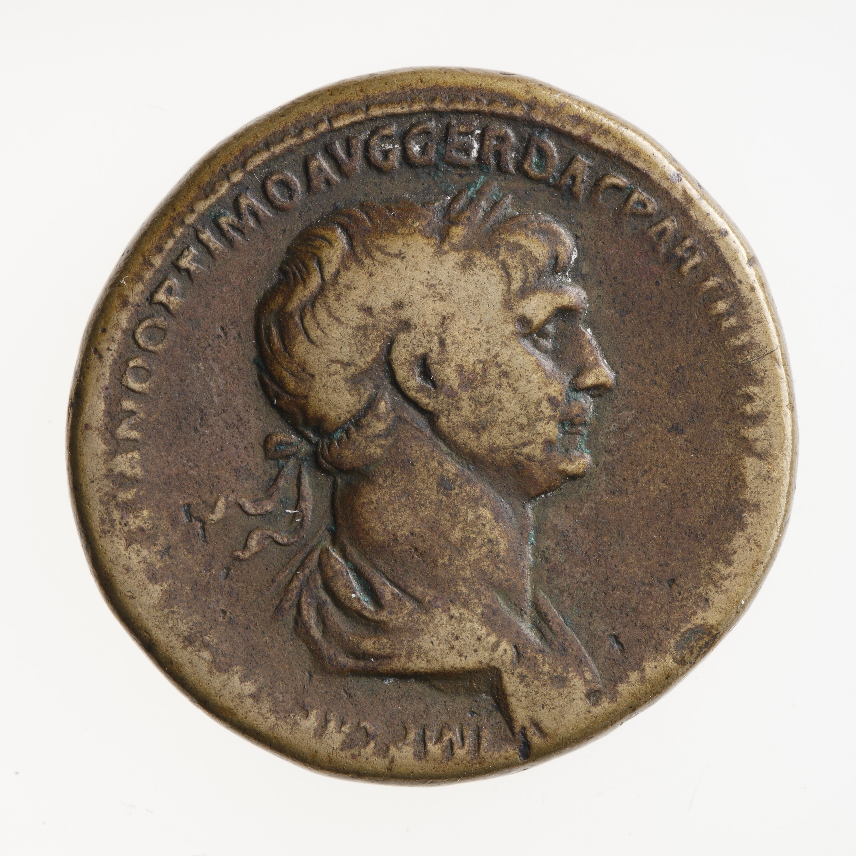 Orichalcum sestertius of the Emperor Trajan struck in the period 114 to 117 AD, Ancient Roman Empire. Minted by Rome. The title OPTIMO (seen in the obverse legend on this coin) was introduced in the legend in 114 AD and retained until Trajan's death in 117 AD.