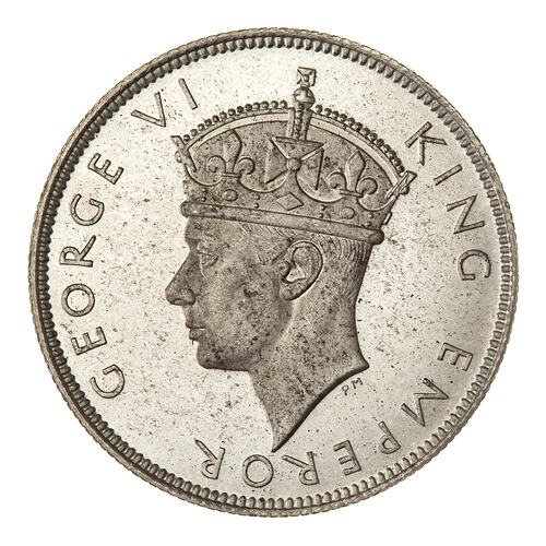 Crowned head of the king facing left; around, GEORGE VI KING EMPEROR; the artist's initials, PM, below the neck truncation