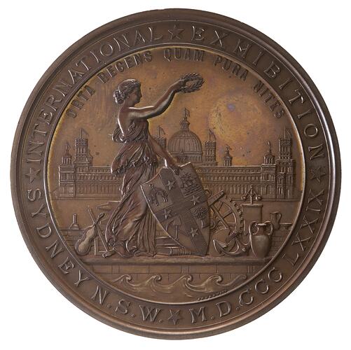 Figure of New South Wales surrounded by works of industry before exhibition building; around, * INTERNATIONAL * EXHIBITION * SYDNEY N.S.W.* M.D.CCC.LXXIX in exergue, waves, below these waves in tiny letters the artists names, J.S. & A.B. WYON