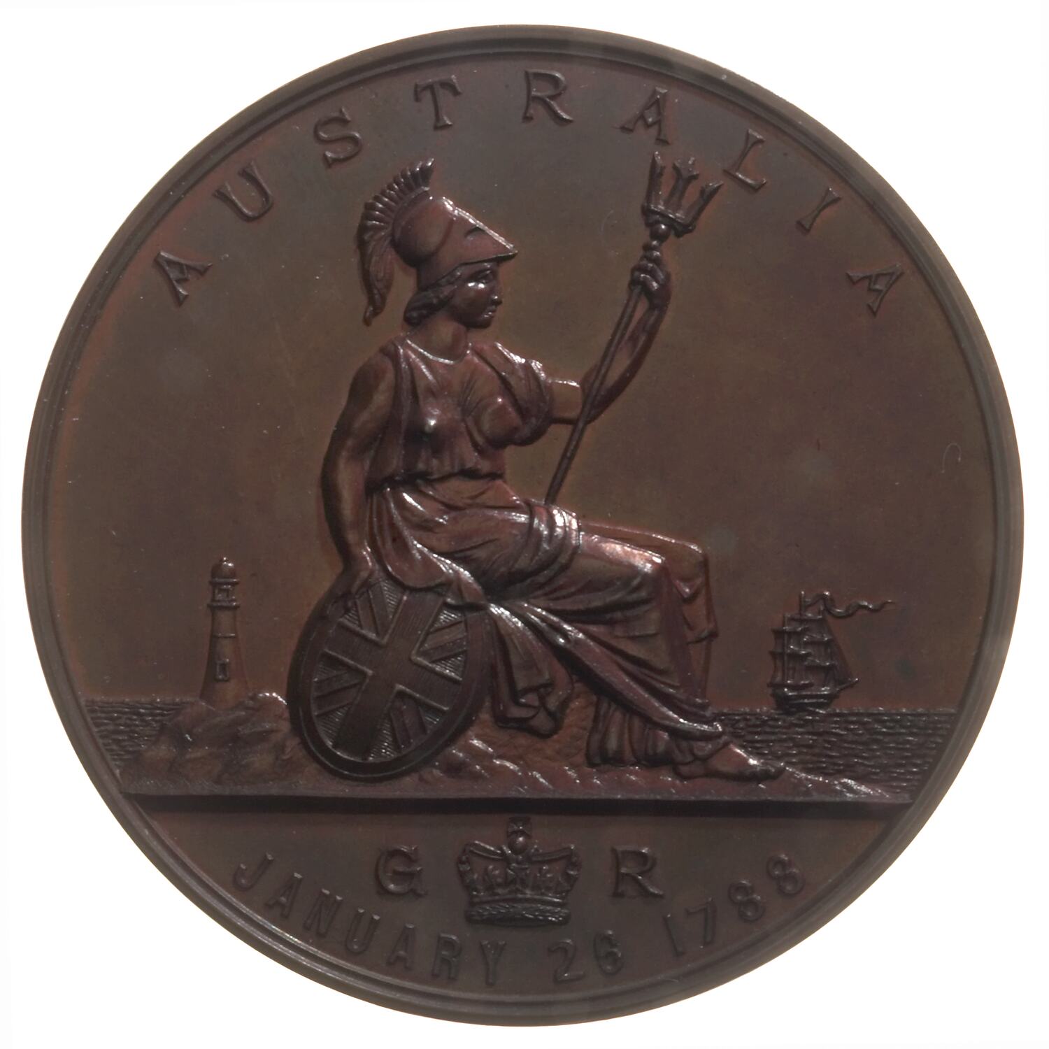 Plain (edge) Australia seated (as Britannia) above, AUSTRALIA; in exergue, G crown R / JANUARY 26 1788 (obverse) Arms of New South Wales within wreath of Australian flora below crown and monogram VR; around; ORTA RECENS QUAM PURA NITES 1888. AMOR in tiny letters near rim at 07(reverse)