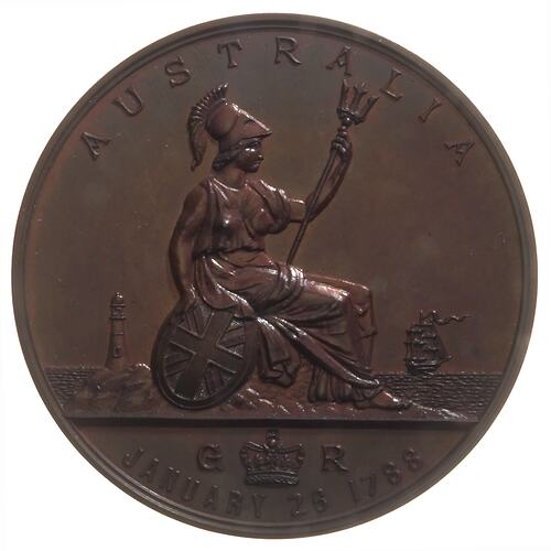 Australia seated (as Britannia) above, AUSTRALIA; in exergue, G crown R / JANUARY 26 1788