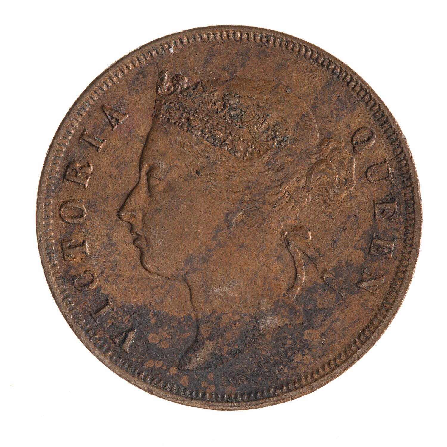Head of the Queen, wearing coronet or diadem ornamented with jewels, facing left; around, VICTORIA QUEEN. The ends of the coronet are connected by a band decorated with a scroll which is partly hidden by the hair. The hair is drawn into a knot behind the head and teied with a bow at the back of the head.