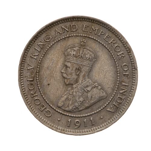 At centre within a circle of beads, crowned and robed bust of the King facing left; around, GEORGE V KING AND EMPEROR OF INDIA 1911; on bust truncation in small letters the artists initials, BM
