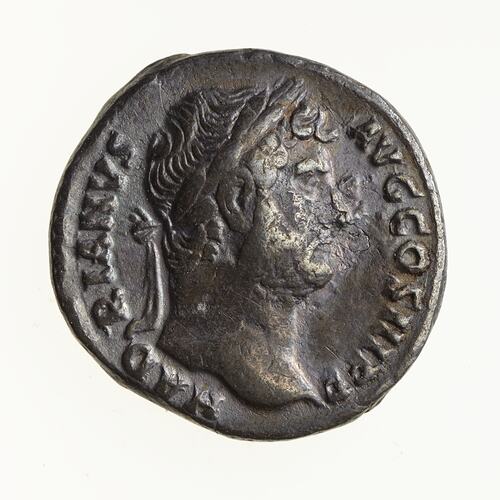 Laureate head of Hadrian facing right; around, HADRIANVS AVG COS III P P