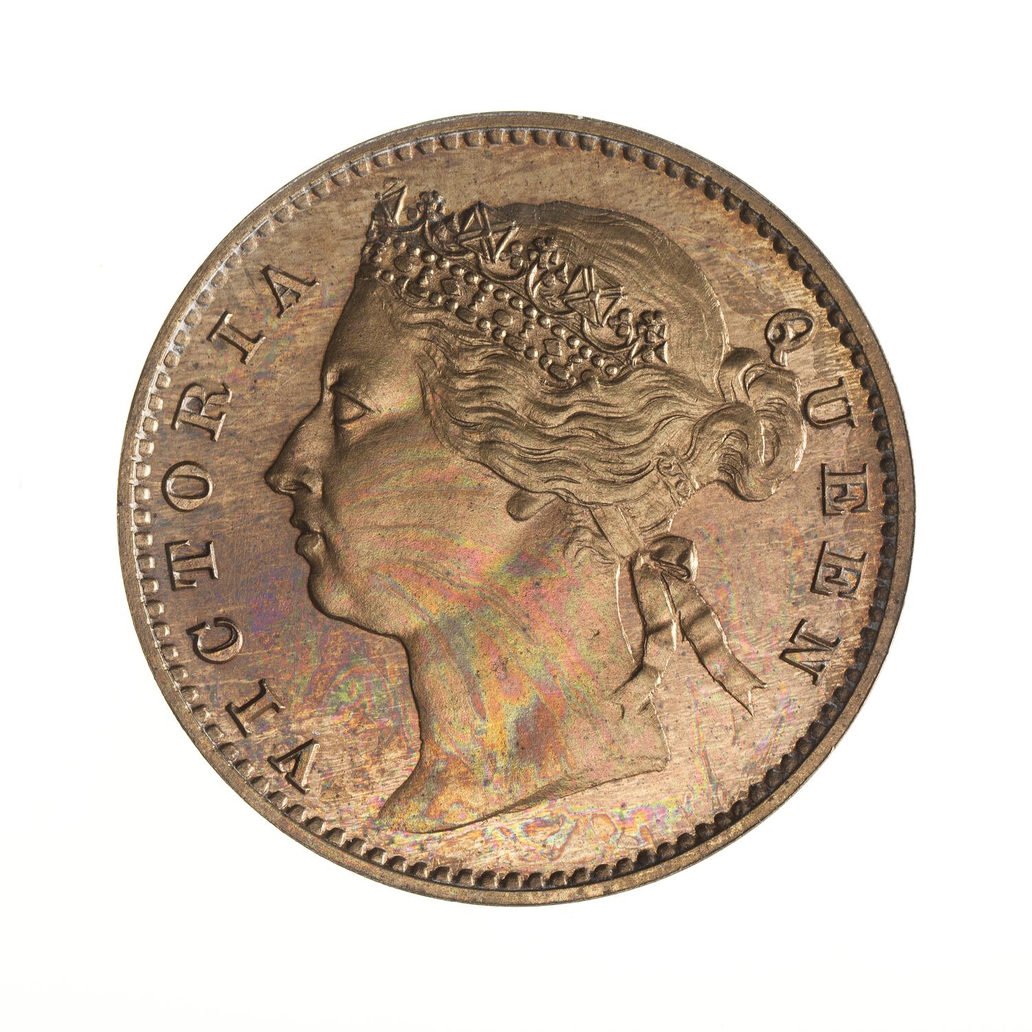The British gained control of Mauritius in 1810 at a time when the Spanish dollar was the standard coin. It produced coins based on the dollar from 1820 (both the general colonial 'anchor money' and coins in French, the main language of the inhabitants). On 12 August 1876 an Order in Council established the Indian Rupee as the legal tender of payment and authorised the production of local Mauritius coins as fractions of the Rupee rather than the old dollar. Bronze coins of 1, 2 and 5 cents together with silver coins of 10 and 20 cents were struck from 1877. This non-bronzed proof example of the 1 cent was prepared for the Melbourne Mint exhibit at the 1880 Melbourne International Exhibition and was re-used for the 1888 Exhibition.
