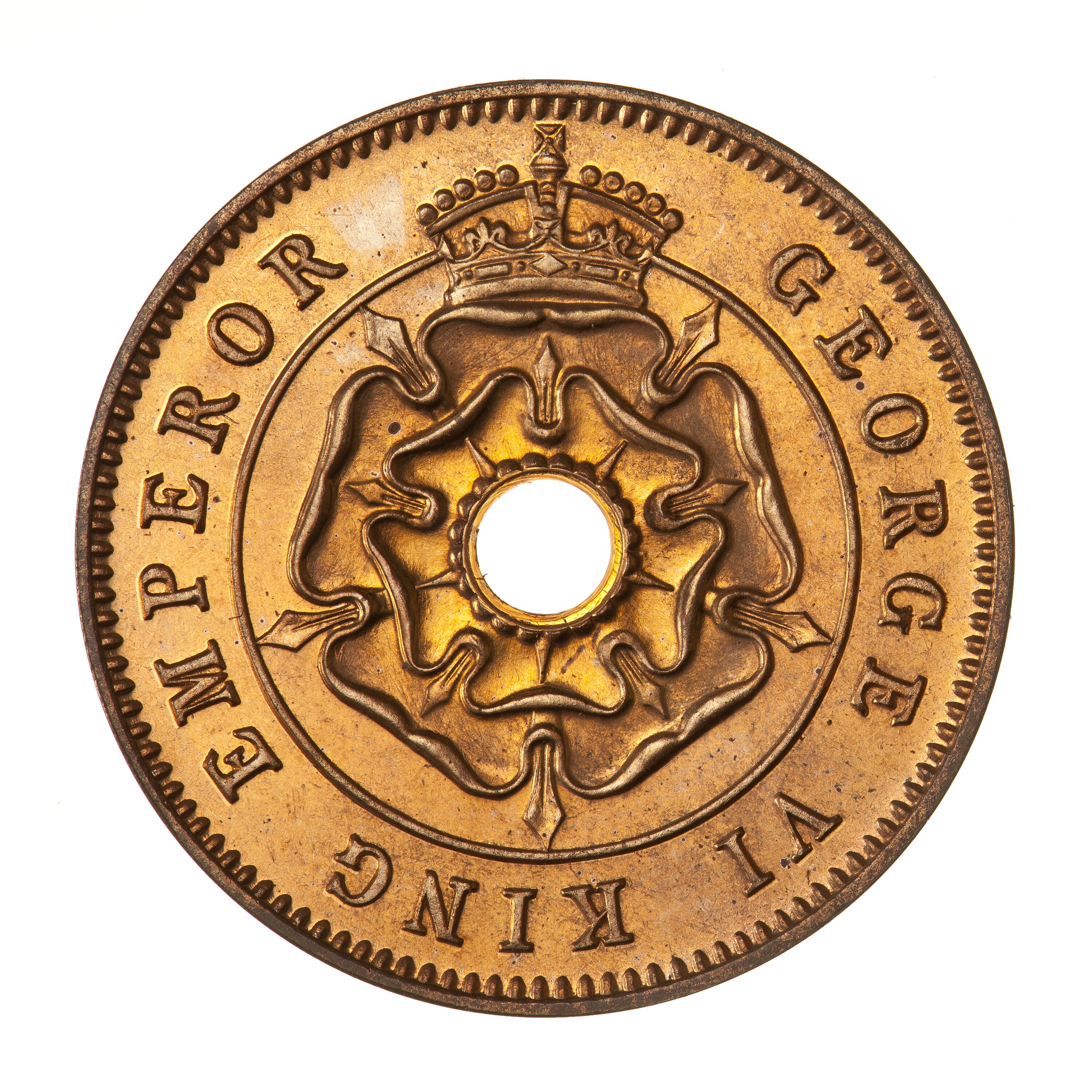 Around hole, a crowned rose; around, GEORGE VI KING EMPEROR