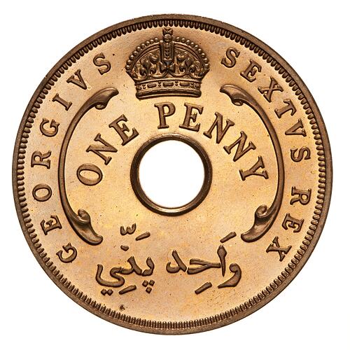 An imperial crown above a central circular hole with a scroll ornament to right and left; below crown, ONE PENNY; around, outside the scroll ornaments, GEORGIVS SEXTVS REX; below hole in Arabic, the denomination