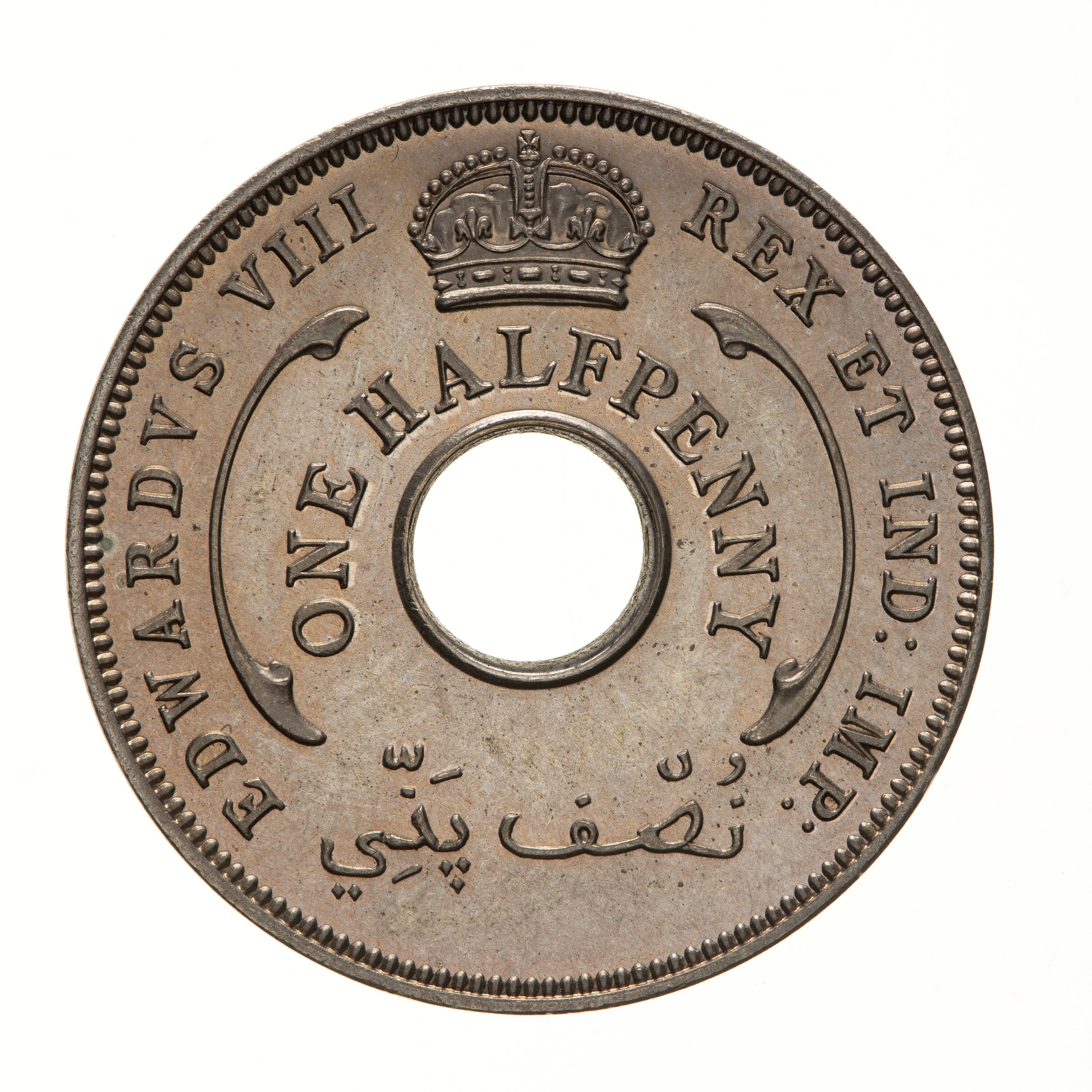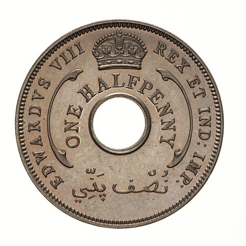 An imperial crown above a central circular hole with a scroll ornament to right and left; below crown, ONE HALFPENNY; around, outside the scroll ornaments, EDWARD VIII REX ET IND: IMP:; below hole in Arabic, the denomination