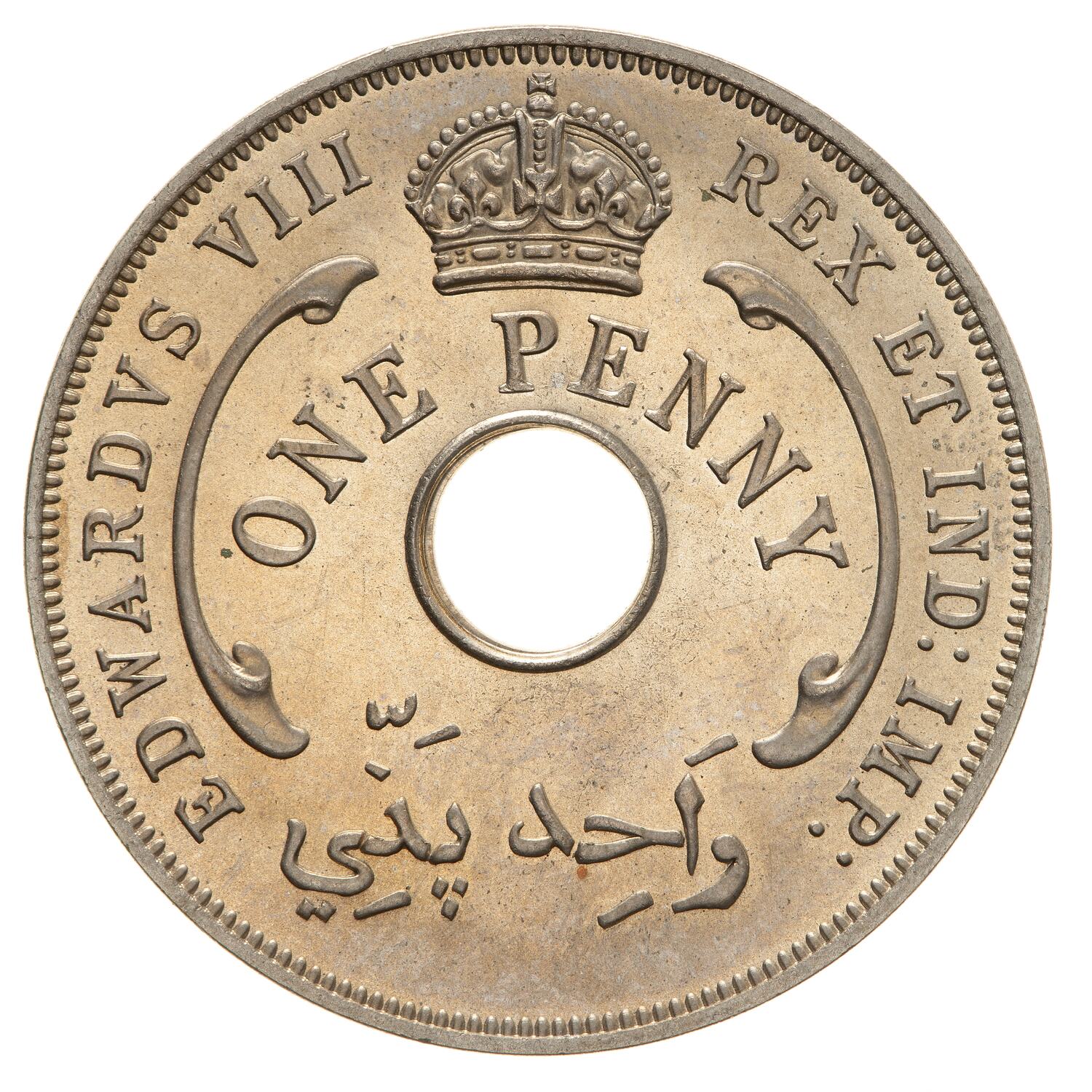 An imperial crown above a central circular hole with a scroll ornament to right and left; below crown, ONE PENNY; around, outside the scroll ornaments, EDWARD VIII REX ET IND: IMP:; below hole in Arabic, the denomination