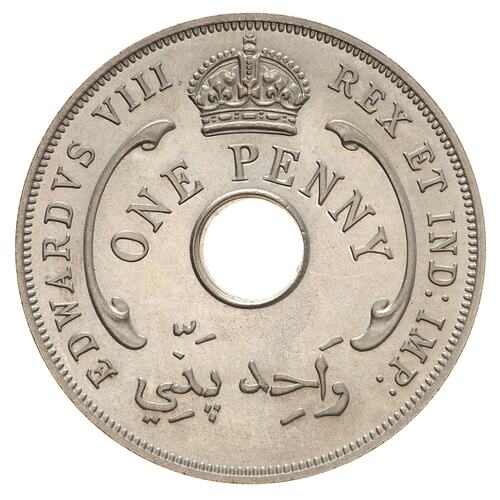 An imperial crown above a central circular hole with a scroll ornament to right and left; below crown, ONE PENNY; around, outside the scroll ornaments, EDWARD VIII REX ET IND: IMP:; below hole in Arabic, the denomination
