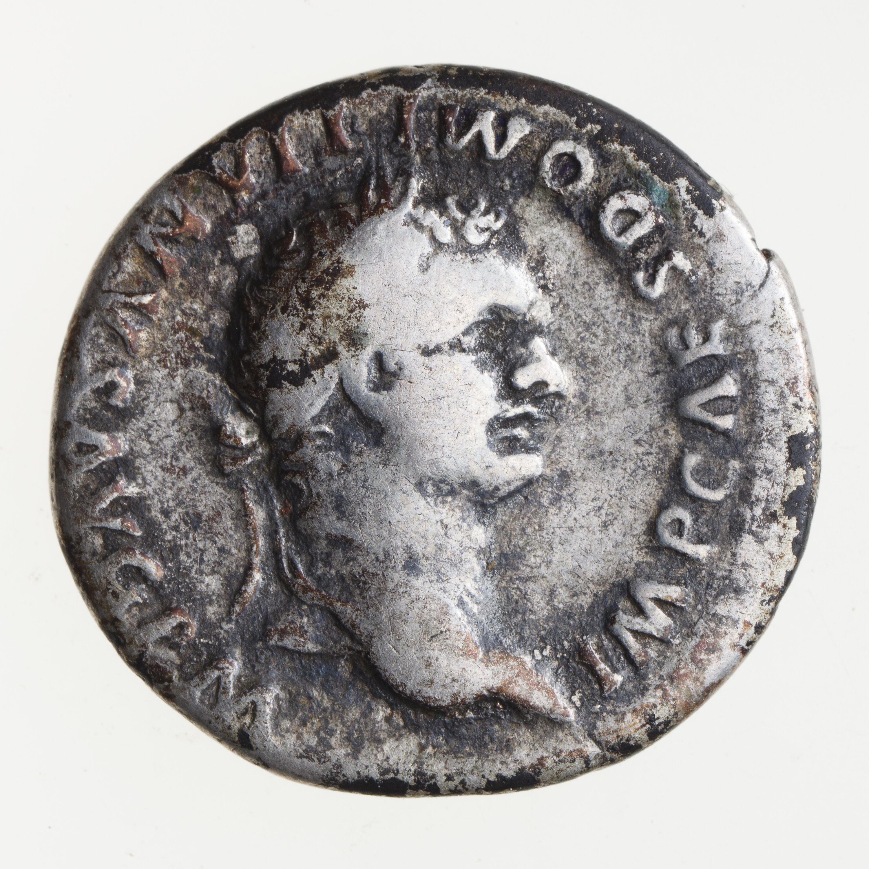 Laureate head of Domitian facing right; around, IMP CAES DOMITIANVS AVG P M