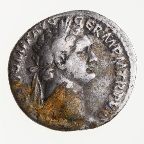 Laureate head of Domitian facing right; around, [IMP C]AES DOMIT AVG GERM P M TR P VII
