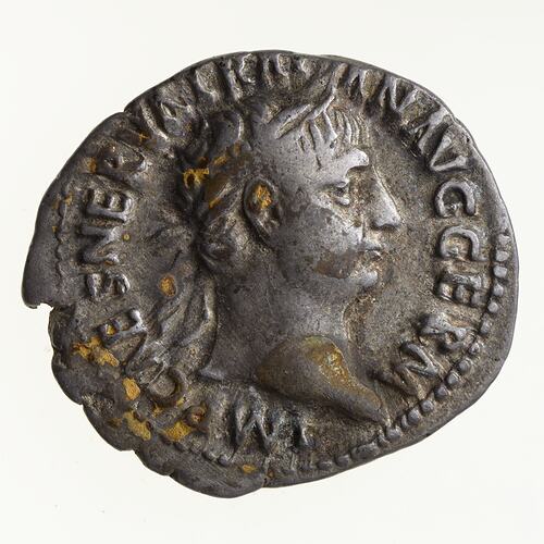 Laureate head of Trajan facing right; around, IMP CAES NERVA TRAIAN AVG GERM