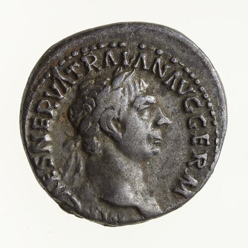 Laureate head of Trajan facing right; around, IMP CAES NERVA TRAIAN AVG GERM