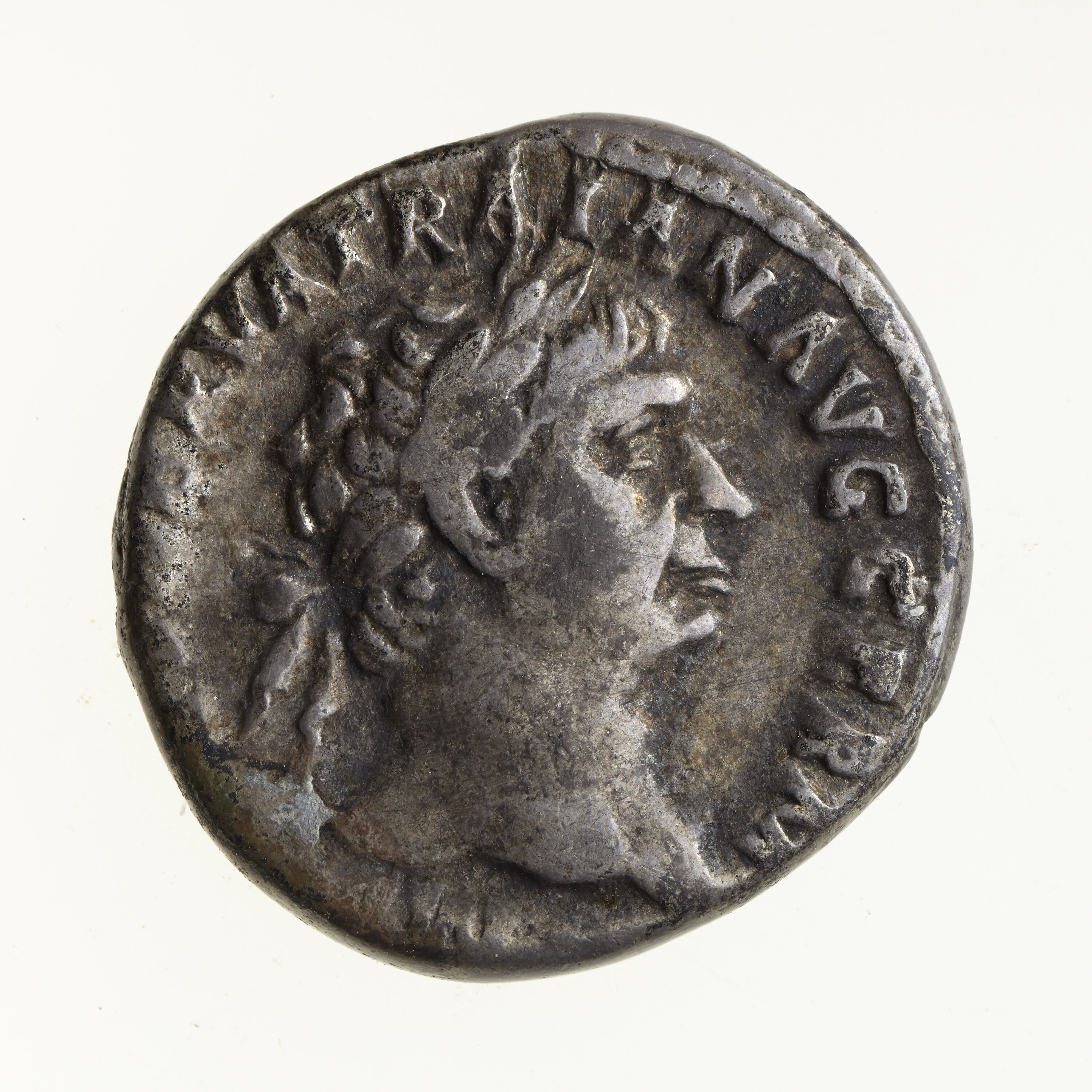 Laureate head of Trajan facing right; around, [IMP CAES] NERVA TRAIAN AVG GERM