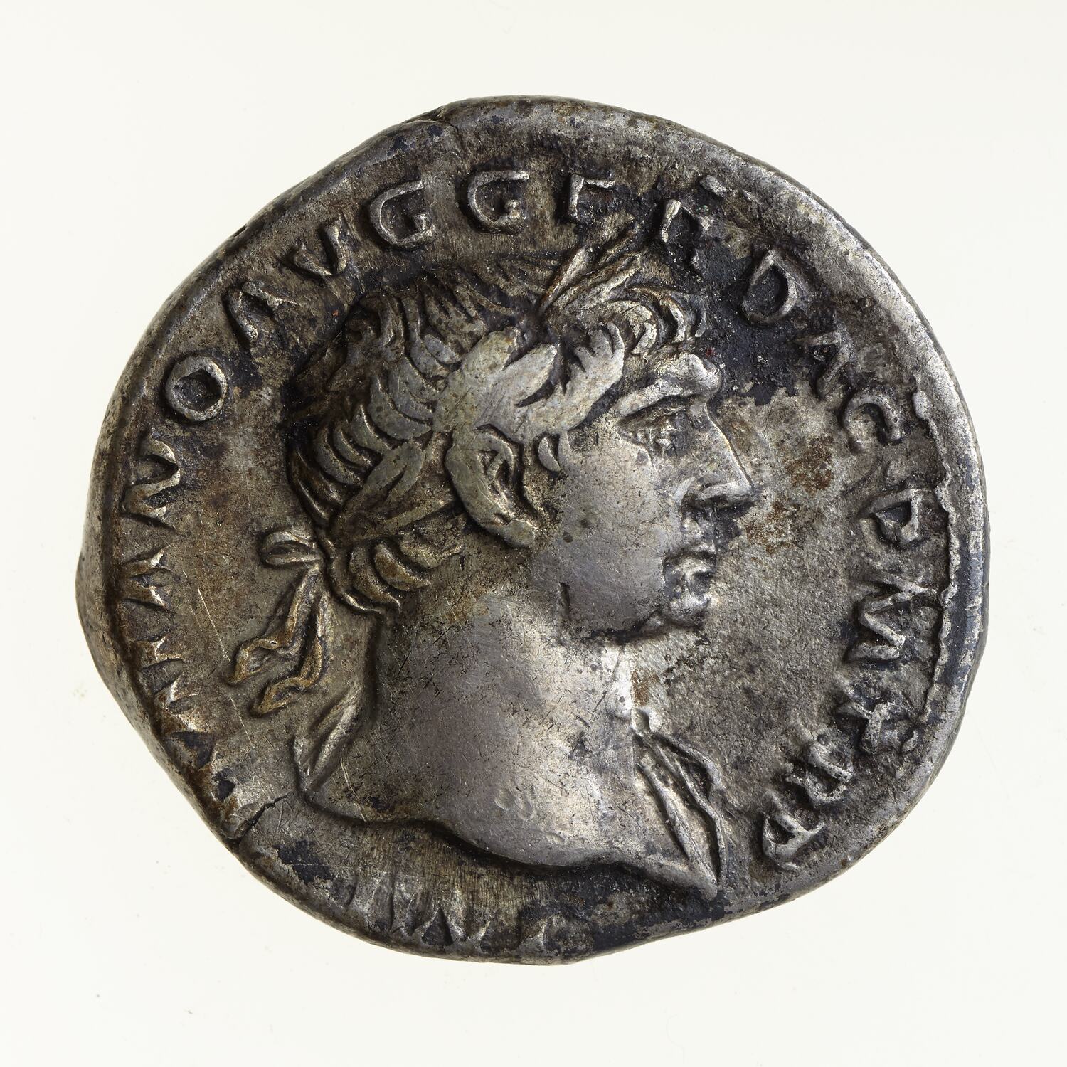 Laureate head of Trajan facing right, drapery on left shoulder; around, IMP TRAIANO AVG GER DAC PM TR P