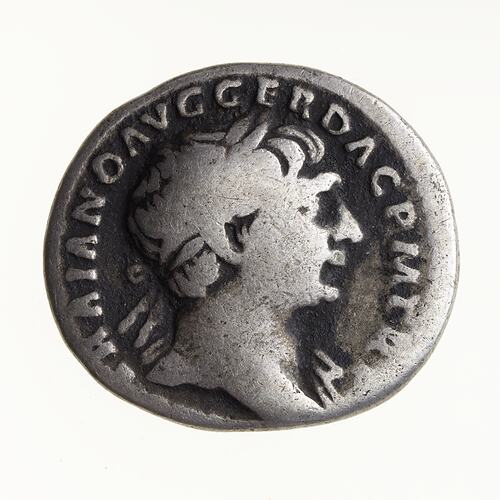 Laureate head of Trajan facing right, drapery on left shoulder; around, IMP TRAIANO AVG GER DAC PM TR P