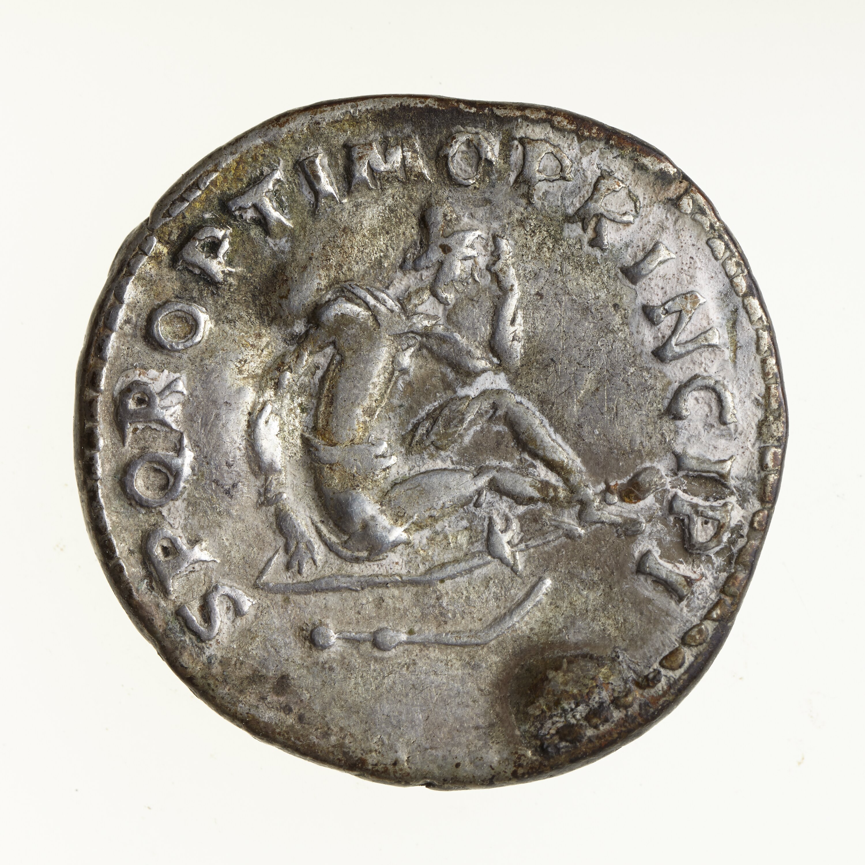 Dacia seated facing right in mournful attitude on a shield; below, a curved sword; around, S P Q R OPTIMO PRINCIPI