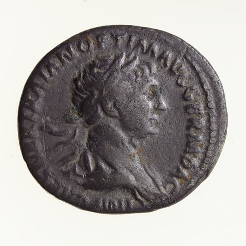 Laureate bust of Trajan facing right; around, IMP CAES NER TRAIAN OPTIM AVG GERM DAC