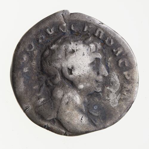 Laureate head of Trajan facing right, drapery on left shoulder; around, [IMP TRAIAN]O AVG GER DAC PM [TR P ]