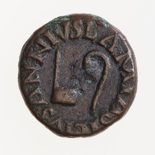 Quadrans struck under the moneyers Lamia, Silius and Annius in 9 BC (all three are named on the coin). Minted by Rome, Ancient Roman Empire. It is uncertain which side represents the true obverse, the arrangement used here is the convension.