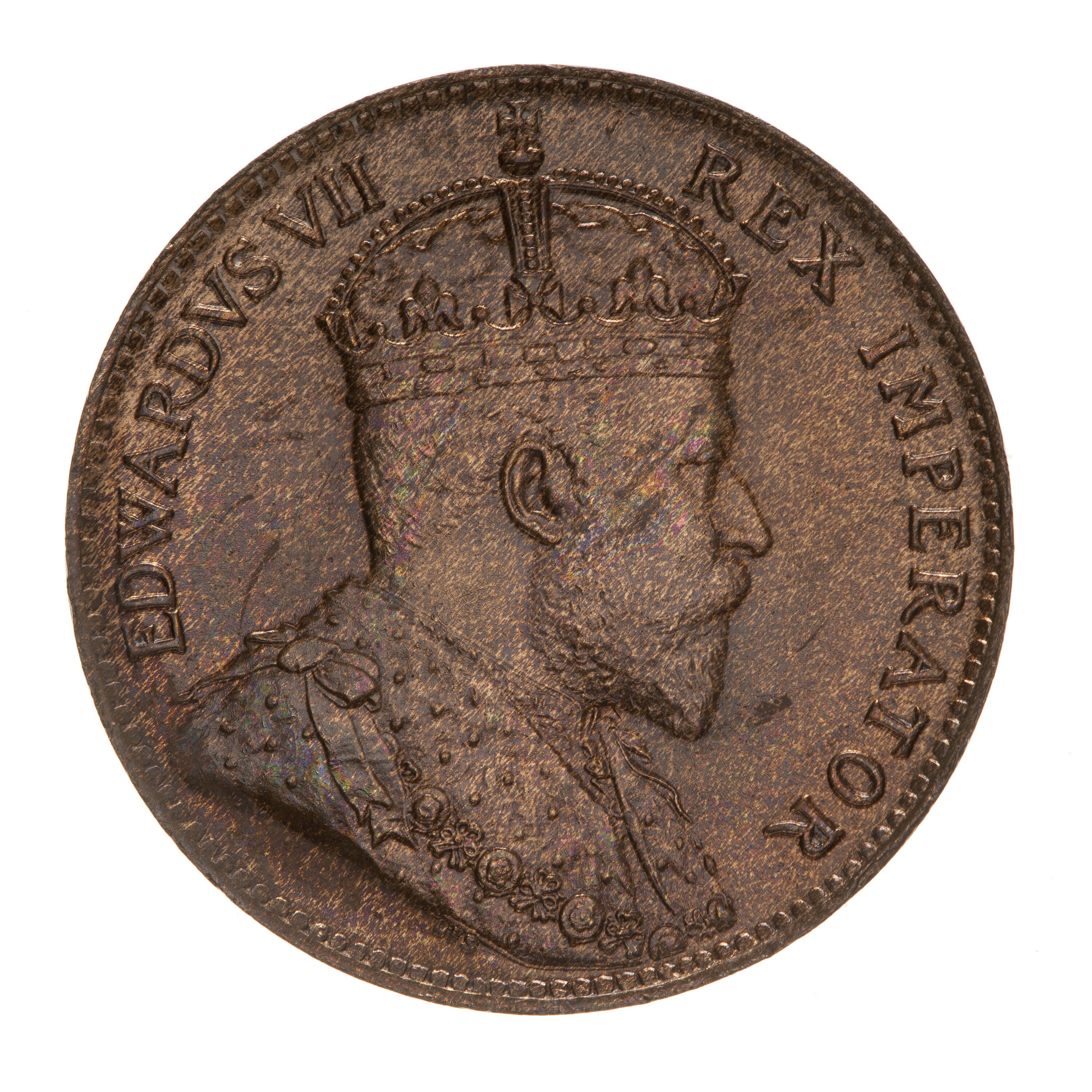 Crowned and draped bust of the King facing right, the King is wearing the Imperial Crown and the ermine Robe of State, the Collar of the Most Honourable Order of the Bath; around, EDWARDVS VII REX IMPERATOR; below the bust truncation, the artist's initials, DES