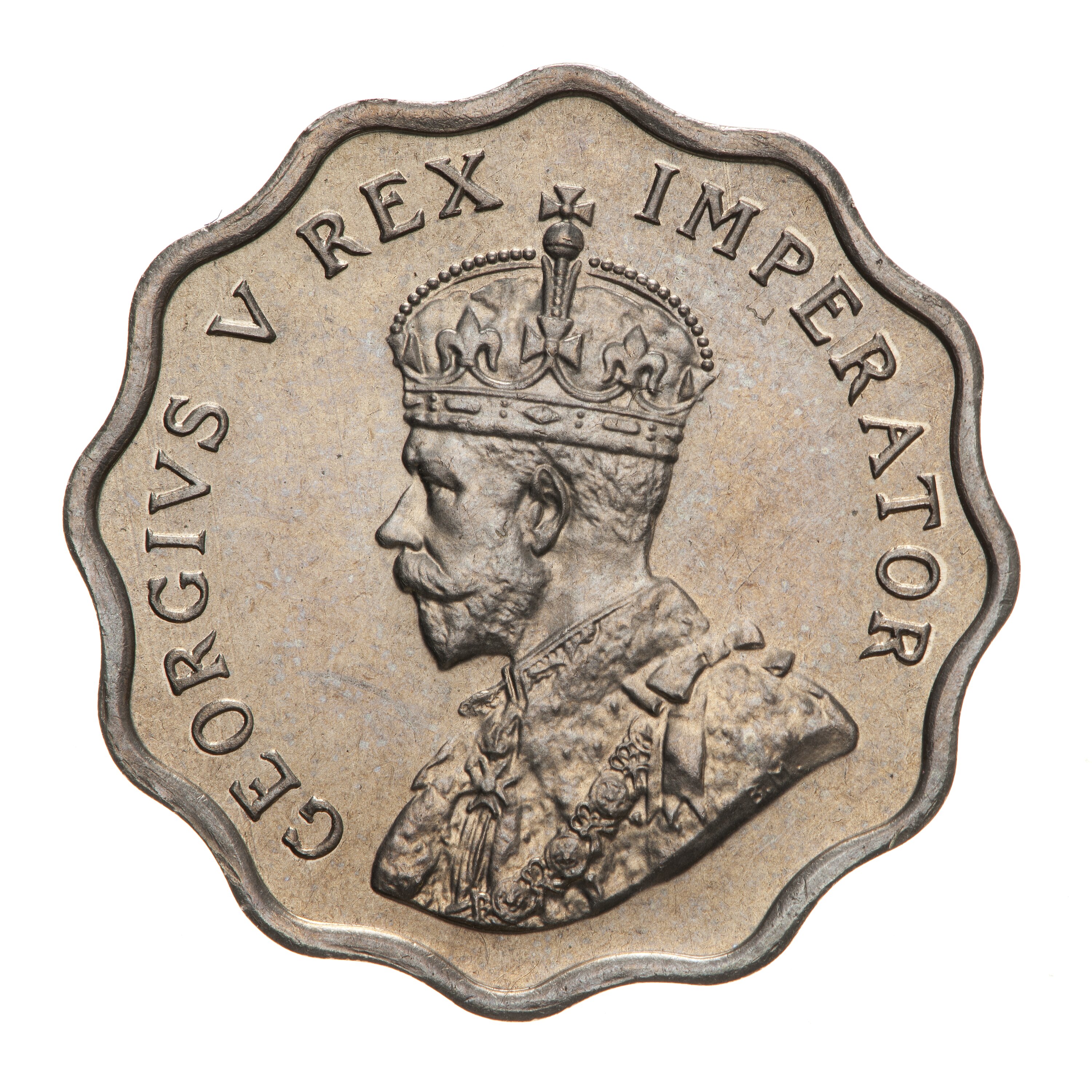 Crowned and draped bust of the King facing left, the King is wearing the Imperial Crown and the ermine Robe of State, the Collar of the Most Noble Order of the Garter, and the Badge of the Most Honourable Order of the Bath; around, GEORGE V REX IMPERATOR; on bust truncation, the artist's initials, BM