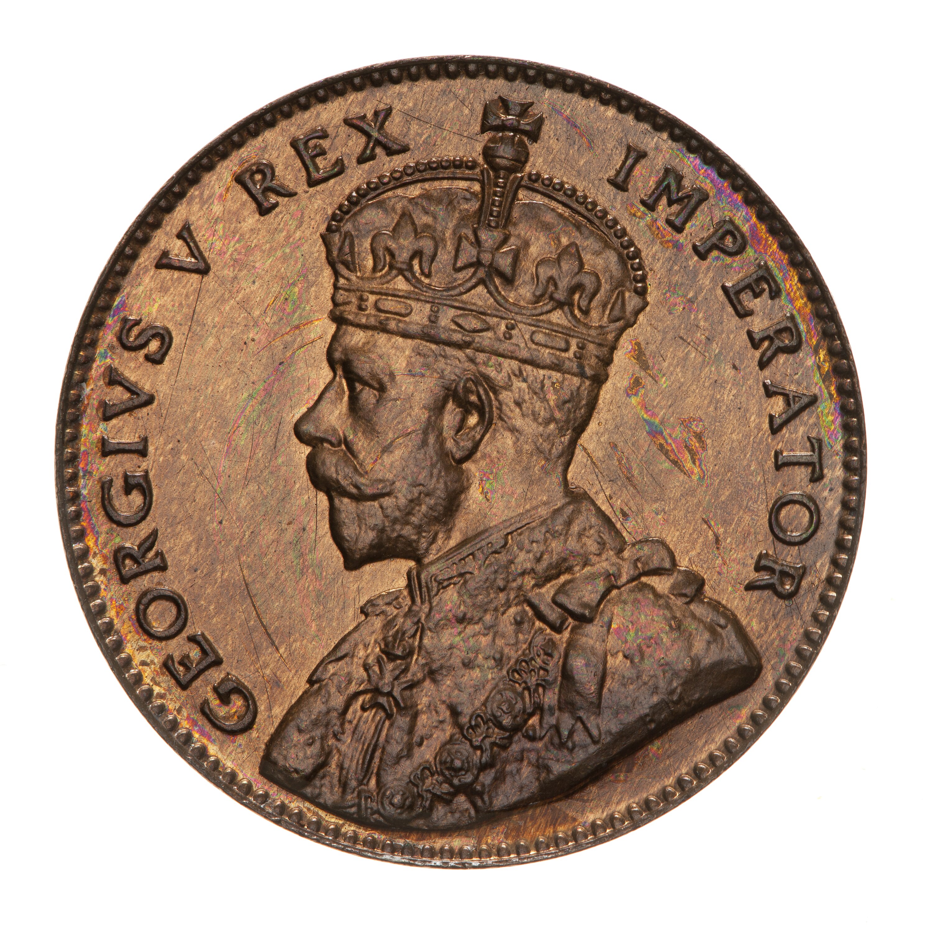 Crowned and draped bust of the King facing left, the King is wearing the Imperial Crown and the ermine Robe of State, the Collar of the Most Noble Order of the Garter, and the Badge of the Most Honourable Order of the Bath; around, GEORGE V REX IMPERATOR; on bust truncation, the artist's initials, BM
