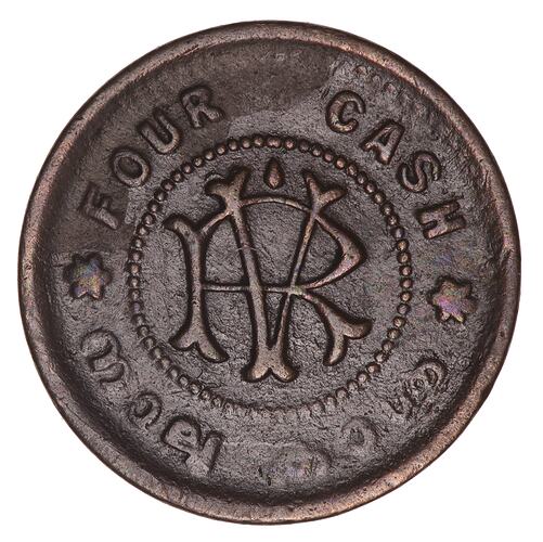 At centre within a circle of beads, the monogram RV (Rama Varma); around above, FOUR CASH ; around below, legend