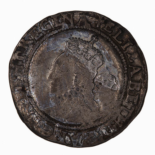 Within an inner bead circle, crowned bust of the Queen, wearing ruff and decorated dress, facing left; behind, rose; around, (mm. Latin Cross) ELIZABETH D G ANG FR ET HI REGINA
