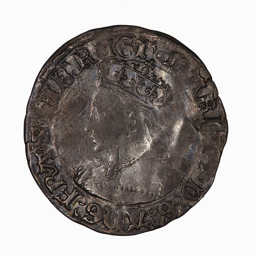 Crowned bust of the Queen facing left wearing a necklace with a pendant cross; around, MARIA (mm. pomegranate) D G ANG FRA Z HIB REGI (annulet stops)